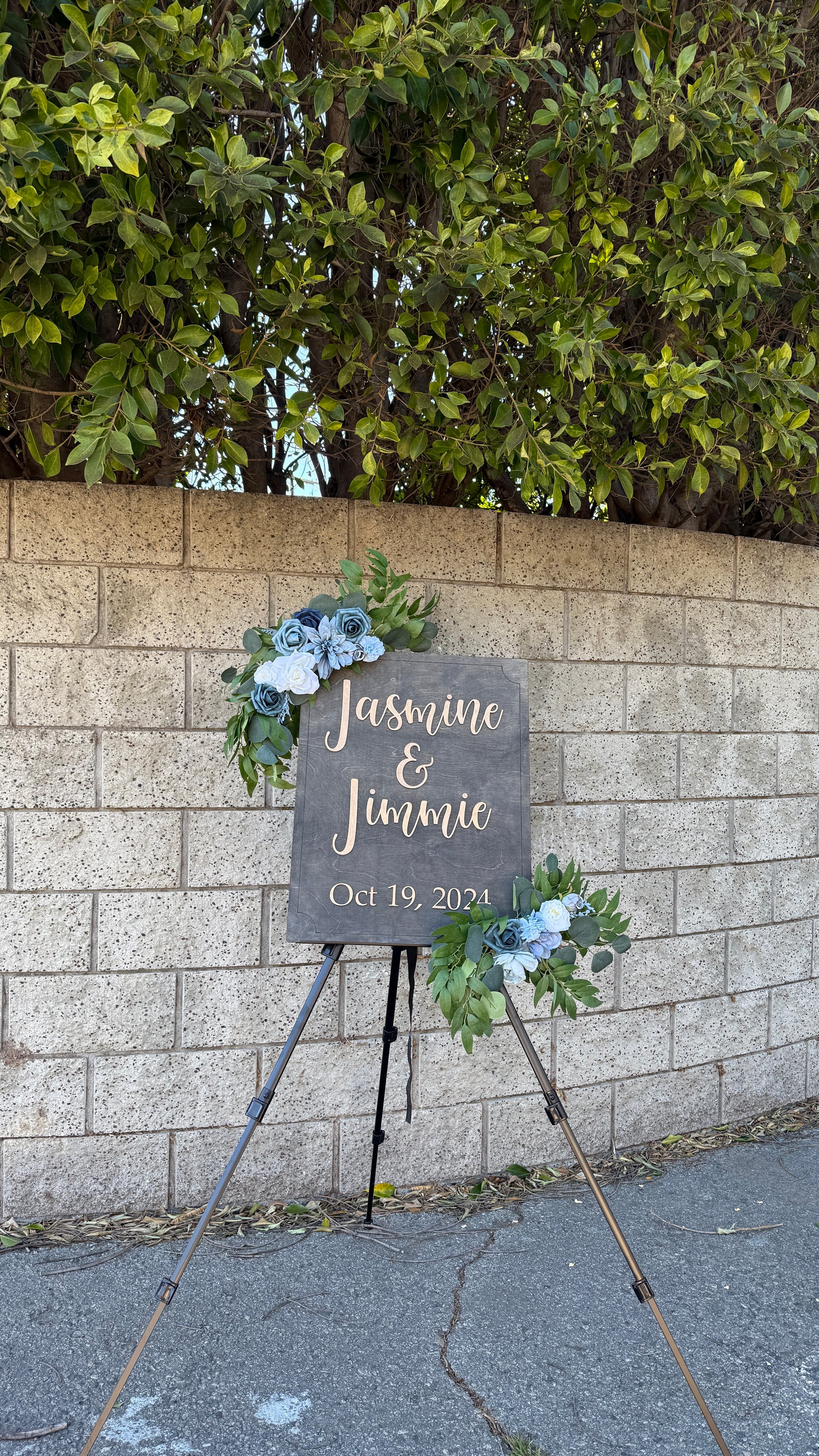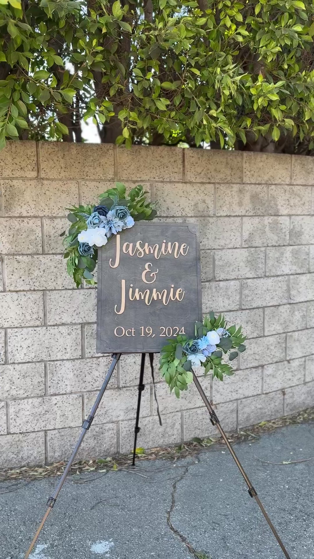 Welcome your guests in timeless style with this handcrafted wooden wedding sign, personalized with the names of the happy couple and their special date. Featuring elegant calligraphy in golden cut out lettering against a rustic stained wood background, this sign adds a romantic and sophisticated touch to any ceremony or reception entrance.